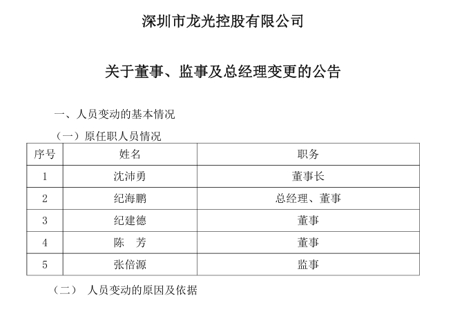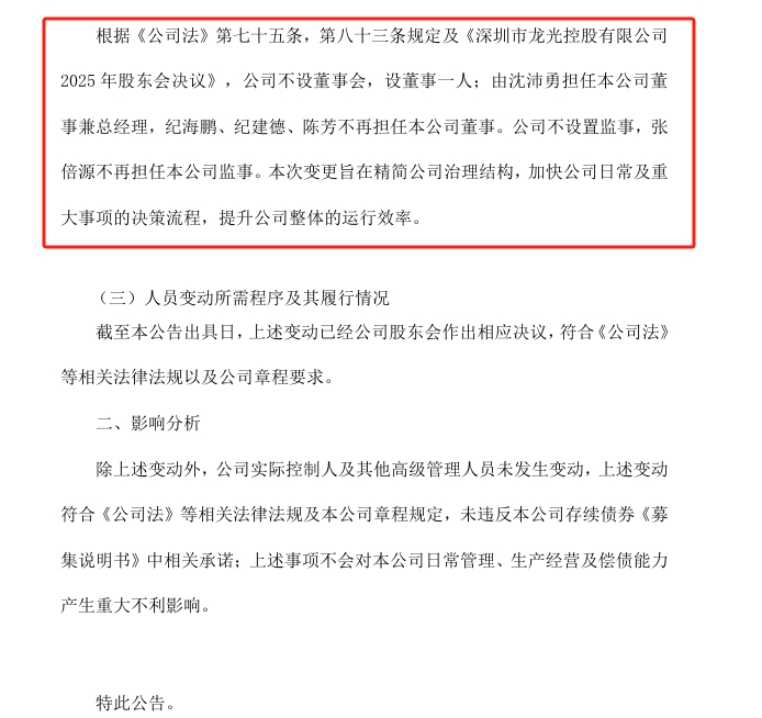 8月25日,深圳市龙光控股有限公司(以下简称“龙光控股”)发布公告,对公司治理结构做出重大调整:不再设立董事会,仅设一名董事兼总经理,由沈沛勇担任;纪海鹏、纪建德、陈芳不再担任公司董事;同时公司不再设置监事,张倍源不再担任监事。