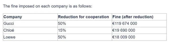 欧盟委员会的调查始于2023年4月的突击搜查,2024年7月正式启动反垄断程序。由于三家企业均承认违法并配合调查,罚款获得不同程度减免,其中古驰与罗意威的罚款减免比例达50%,最终分别被罚1.197亿欧元、1800.9万欧元,蔻依则被罚1969万欧元。