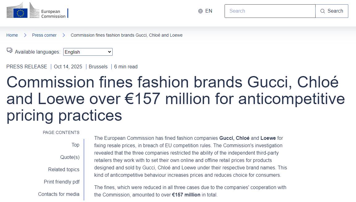 据了解,这三家品牌分属法国开云集团、瑞士历峰集团与法国路威酩轩集团旗下,均在高端服装、皮具及配饰等领域开展业务。调查显示,它们实施了“转售价格维持(RPM)”行为,通过多种限制干预合作的线上及线下第三方零售商商业策略,包括要求零售商不得偏离建议零售价、设定最高折扣率、限定特定促销时段,部分情况下甚至禁止提供任何折扣,强制零售商采用与品牌直营渠道一致的价格条件。此类行为覆盖整个欧洲经济区,持续数年,被指抬高了商品价格并缩小了消费者选择范围。
