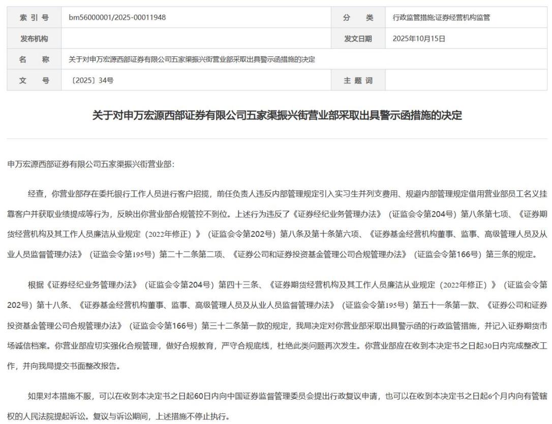 近日,新疆证监局发布〔2025〕34号监管函,唯一一家base新疆的券商申万宏源西部证券有限公司旗下五家渠振兴街证券营业部,因多项违规操作被采取出具警示函的行政监管措施,并记入证券期货市场诚信档案,时任营业部负责人魏泽也一同被问责。