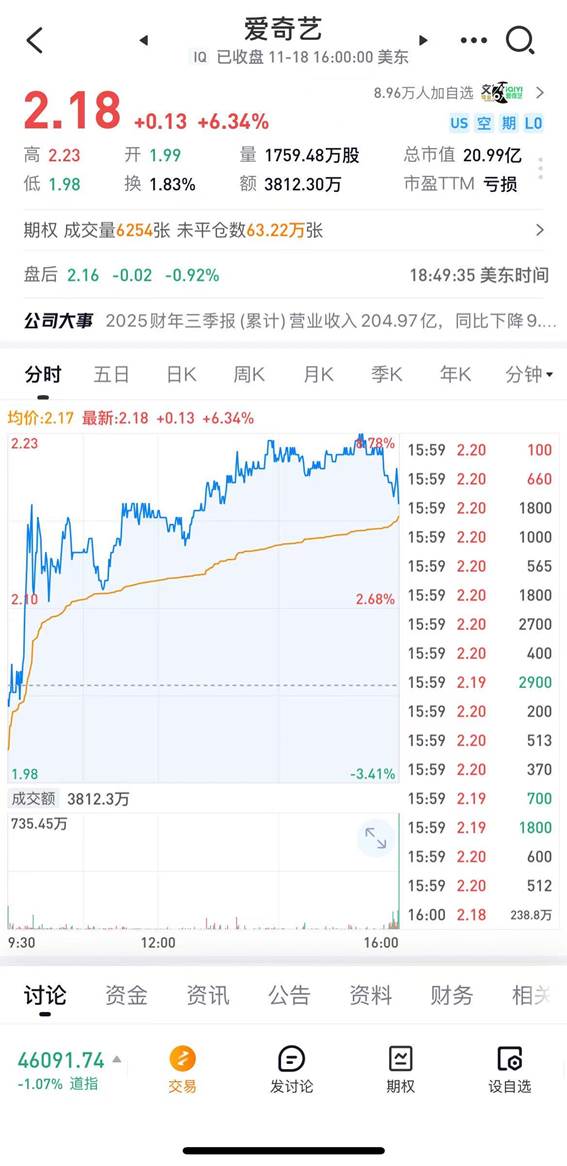 11月18日,爱奇艺发布截至2025年9月30日未经审计的第三季度财报。当季,爱奇艺总收入为66.8亿元人民币。其中,会员服务收入42.1亿元,环比增长3%;在线广告服务收入12.4亿元,内容发行收入6.4亿元,其他收入5.9亿元。在当天的财报电话会上,爱奇艺首席执行官龚宇表示,过去三年,AI技术已深度融入到业务运营中,未来将聚焦AIGC的三大核心方向发力。 当天美股开盘后,爱奇艺股价一度涨超5%。最终收盘时报2.18元,上涨6.34% 、瑞银、花旗等多家机构给出“买入”评级。