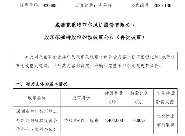 11月24日,克莱特(920689.BJ)发布公告称,股东深圳市中广核汇联二号新能源股权投资合伙企业(下称“中广核汇联”)计划自公告披露之日起15个交易日后的3个月内,通过集中竞价方式减持克莱特股份不超过88.08万股,占总股本的1.20%,减持原因为经营计划需求,股份来源为北交所上市前取得。