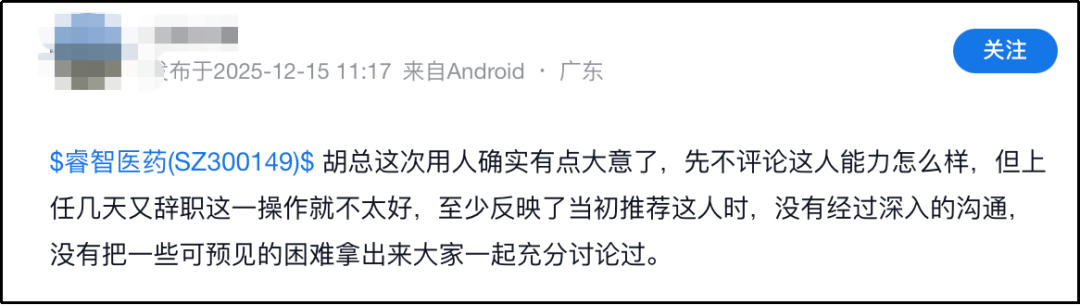 ▲部分网友对睿智医药董秘辞任的评论,来源:雪球