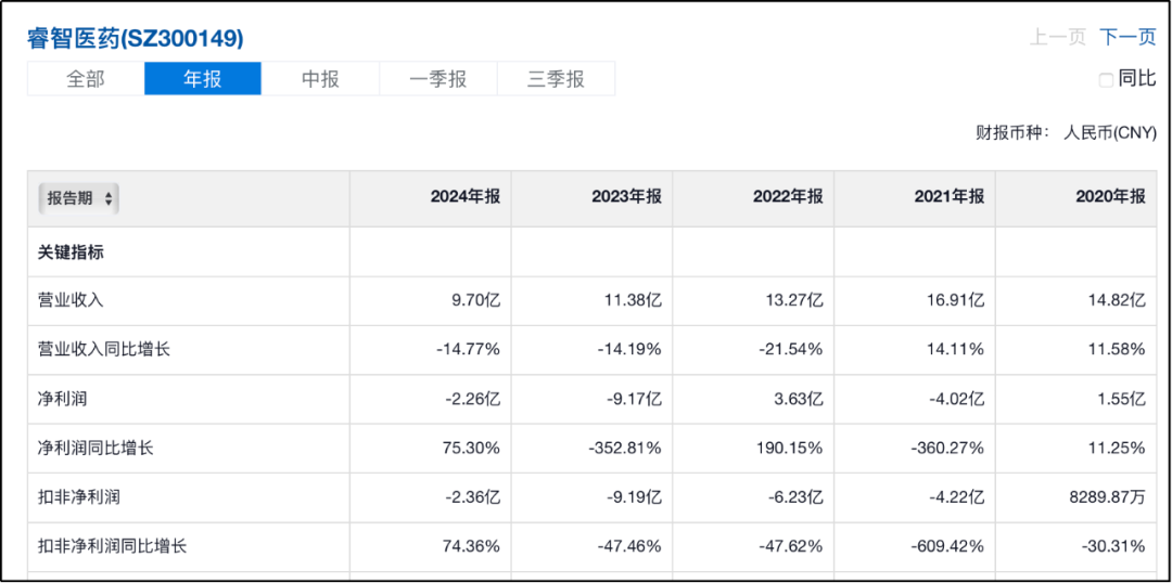 《星岛》了解到,2021年睿智医药营收近17亿元,却首次出现净利润亏损,此后三年营收规模持续走低,亏损也逐步扩大,2021年至2024年累计亏损22亿元。