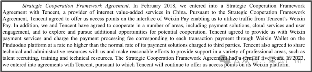 这份协议在2023年2月到期后,拼多多在财报中低调透露双方于2023年签署协议,腾讯将继续在其微信平台上向拼多多提供接入点,但是详细的合作内容却并未透露。