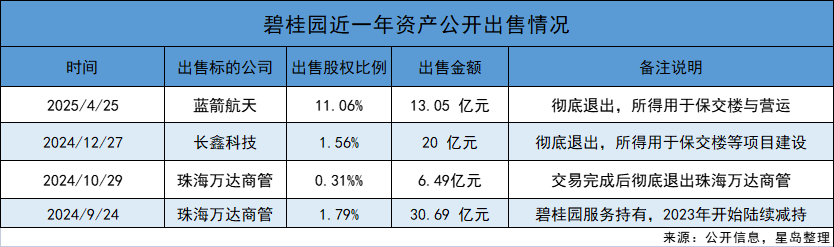 据《星岛》不完全统计,从2024年12月至今,碧桂园公开披露出售的战略投资性股权资产总计已超60亿元,如20亿出售长鑫科技约1.56%股权、13.05亿元出售蓝箭航天约11.063%股份等。