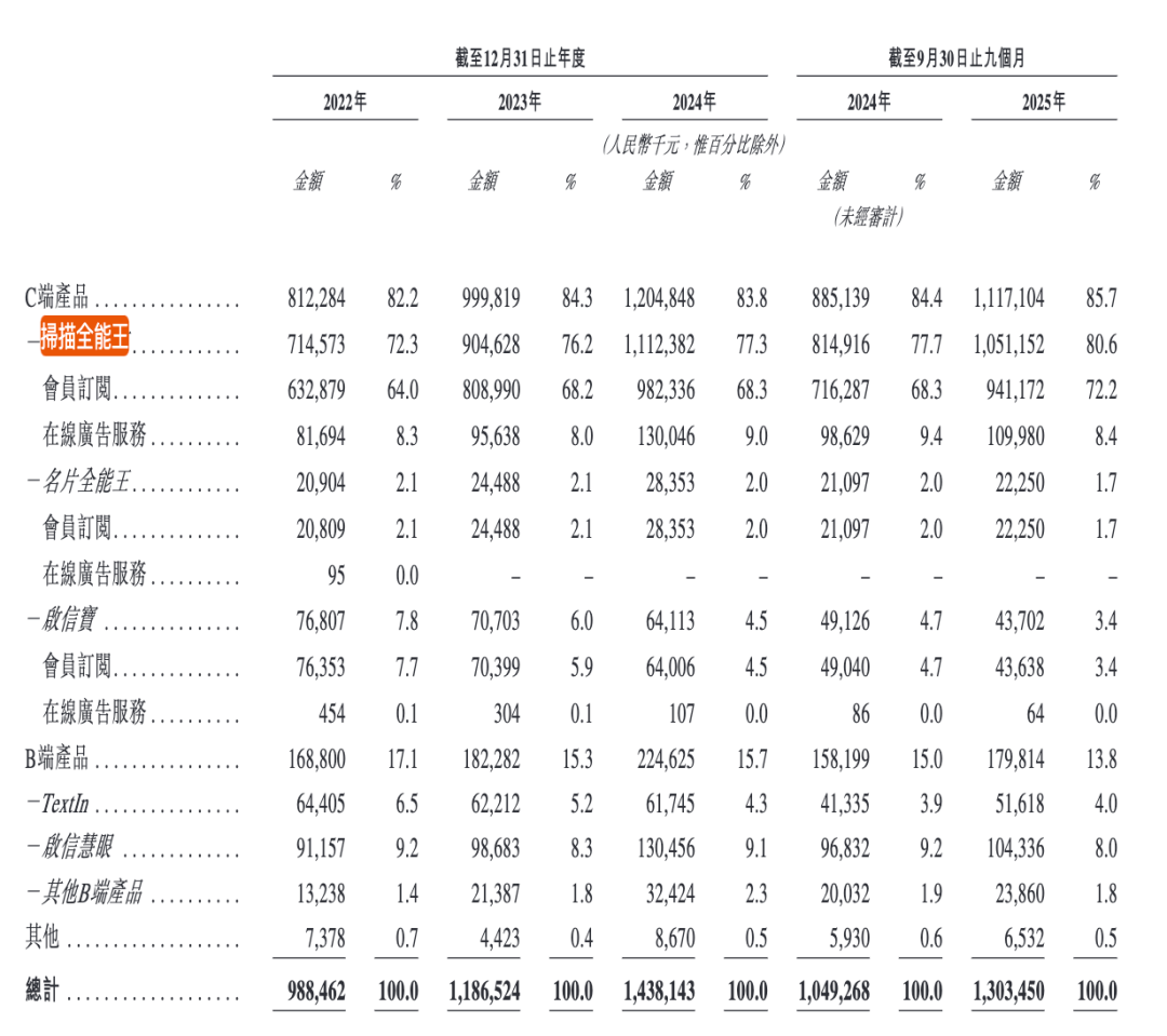 然而,其中大部分都来自于一款产品——扫描全能王。据招股书,2022年-2025年前三季度,扫描全能王贡献的收入分别为7.15亿元、9.05亿元、11.12亿元和10.51亿元,分别占同期总收入的72.3%、76.2%、77.3%及80.6%,占比不断增加,依赖度逐年上升。