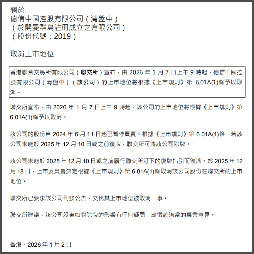 香港联合交易所有限公司(联交所)宣布,由2026年1月7日上午9时起,德信中国(02019.HK)控股有限公司(清盘中)的上市地位将根据《上市规则》第6.01A(1)条予以取消,正式告别香港资本市场。