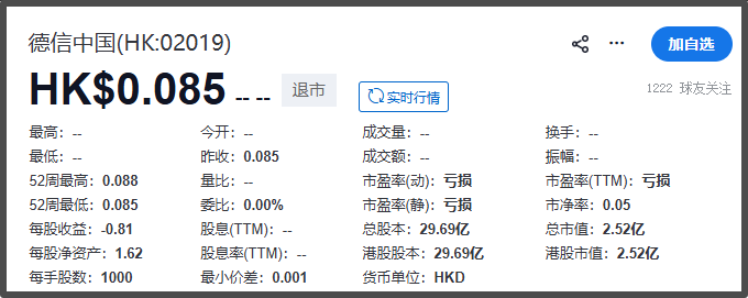 截至退市前,德信中国报0.085港元/股,市值仅剩2.52亿港元。