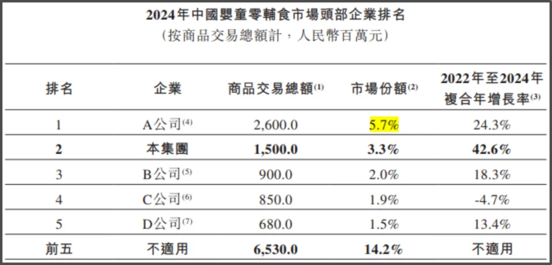 招股书显示,中国婴童零辅食企业仍处于高度分散的竞争格局中,2024年前五大市场参与者的商品交易总额占比仅为14.2%。其中,爷爷的农场以15亿元的交易总额位列第二,市场份额约3.3%;而排在第一位的企业虽未披露,但结合公开信息可明确为英氏控股,其市占率为5.7%,交易总额相当于爷爷的农场的1.7倍。