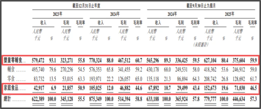 从经营数据对比来看,两者规模虽存在差距,但盈利水平却趋同。2023年至2025年前三季度,爷爷的农场营收分别为6.22亿元、8.75亿元及7.80亿元,尽管保持快速增长,但规模仍不及英氏控股同期的一半。盈利层面,该公司各期的毛利率分别为55.5%、58.8%及57.3%,与英氏控股的差距逐渐缩小,2024年毛利率甚至反超英氏控股1.34个百分点。