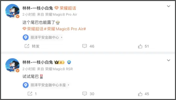 另据荣耀中国区副总裁、智慧生活业务部部长 @林林 爆料,两款新机名称分别为——荣耀Magic8 Pro Air和Magic8 RSR保时捷设计。