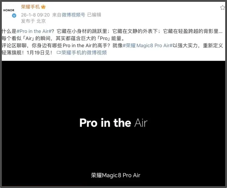 这两款机型分别针对“超轻薄小屏旗舰”和“影像超大杯”两个细分市场,并将在1月19日发布。至此,荣耀Magic8系列形成了覆盖常规、影像、轻薄和奢侈联名的四机型阵容,或将进一步冲击高端旗舰市场。