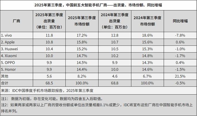 另据IDC数据显示,2025年第三季度,荣耀出货量为990万部,以14.4%的市场份额位列国内市场第五。