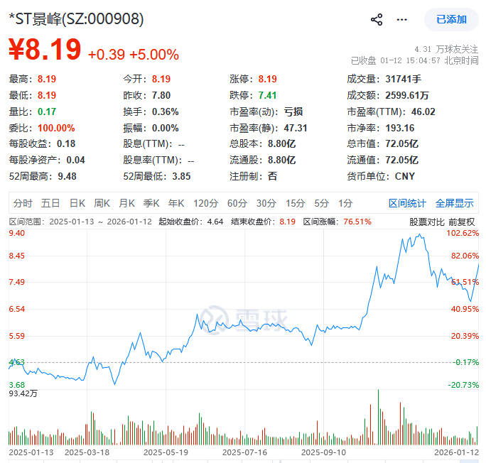 而受2024年8月石药集团将牵头重整的消息影响,过去一年半ST景峰的股价已飙升数倍,仅2024年下半年涨幅就超750%,从1元/股左右最高涨至6元/股。近3个月,该公司的股价涨幅亦达到40%左右,截至1月12日收盘,ST景峰股价为8.19元/股,涨幅5%,总市值72.05亿元。