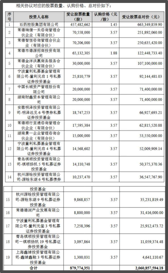 其中,石药集团仍为牵头人,受让股票数量已超一半,约为4.57亿股,认购价格1.45元/股,较此前价格上涨45%,受让股票总对价约为6.63亿元。