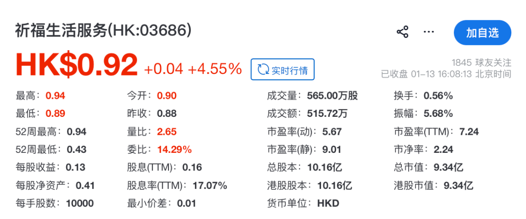 最新股价显示,截至1月13日收盘,祈福生活服务股价为0.92港元/股,涨幅4.55%,总市值仅9.34亿元。