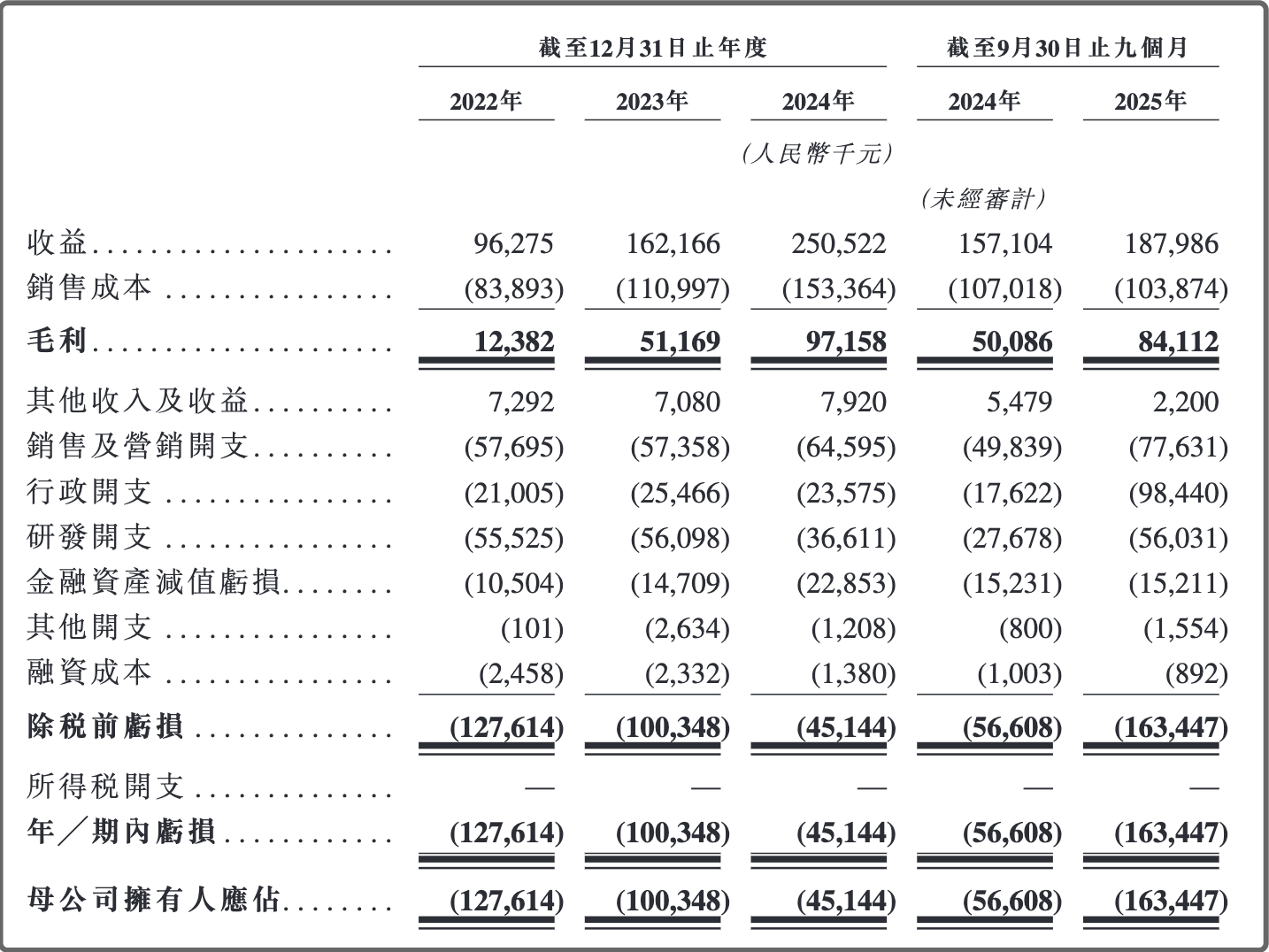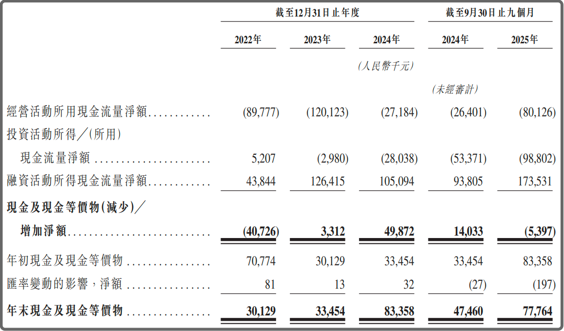 另外需要注意的是,公司2022年至2025年前三季度的的经营活动现金流量均为负数,分别为-8977.7万元、-1.2亿元、-2718.4万元以及-8012.6万元。“于往绩记录期间,我们持续录得经营活动现金流出净额波动,与我们的税前亏损状况及营运资金项目的变动大致相符,对我们的经营现金流造成负面影响,并反映于原材料采购及存货以及贸易应收款项随著业务增长而增加。”