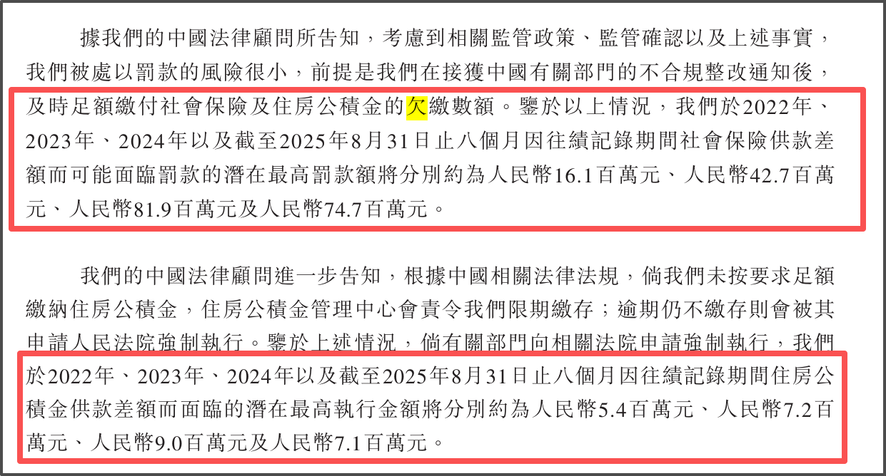 老乡鸡在招股书中表示,根据中国法律规定,老乡鸡面临相应罚款与强制执行风险。2022—2024年及2025年前八个月,因社保供款差额可能面临的潜在最高罚款额分别约为1610万元、4270万元、8190万元及7470万元;因公积金供款差额可能面临的潜在最高执行金额分别约540万元、720万元、900万元及710万元。不过其法律顾问表示,若接到整改通知后及时足额补缴,被处罚的风险较小。