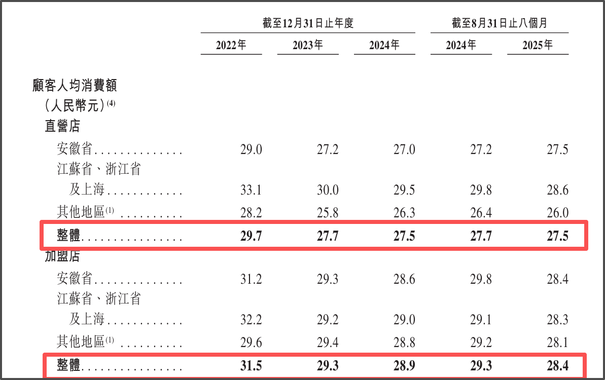 此外,在“极致性价比”成为消费主流的当下,老乡鸡也面临着“涨价丢客、降价亏利”的两难境地。招股书显示,为了吸引消费者,该公司不断降低客单价,直营店顾客人均消费金额从2022年的29.7元下降至2025年前八个月的27.5元,加盟店顾客人均消费金额则从31.5元降至28.4元。