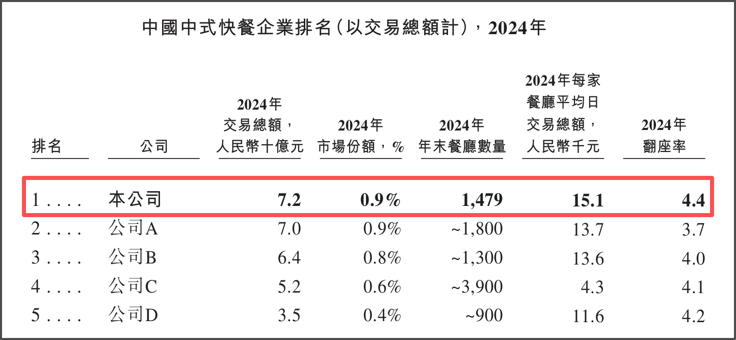 作为行业“头部玩家”,老乡鸡业绩基本面不乏亮点。2022至2024年,公司营收从45.28亿元增至62.88亿元,归母净利润从2.52亿元增至4.09亿元。按2024年交易总额计算,老乡鸡以0.9%的市场占有率位居中式快餐行业第一。