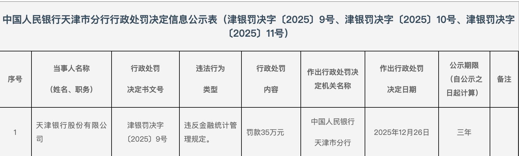 10年多时间里,天津银行也暴露出不少问题,收到了来自有关部门的监管罚单。例如,据中国人民银行网站,今年1月7日,天津银行存在“违反金融统计管理规定”的行为,中国人民银行天津市分行决定对其处以罚款35万元。2022年10月,天津银行济南分行被中国人民银行济南分行处以罚款189.4万元,主要违法违规事实包括“金融统计指标数据错报”“违反账户管理规定”等。