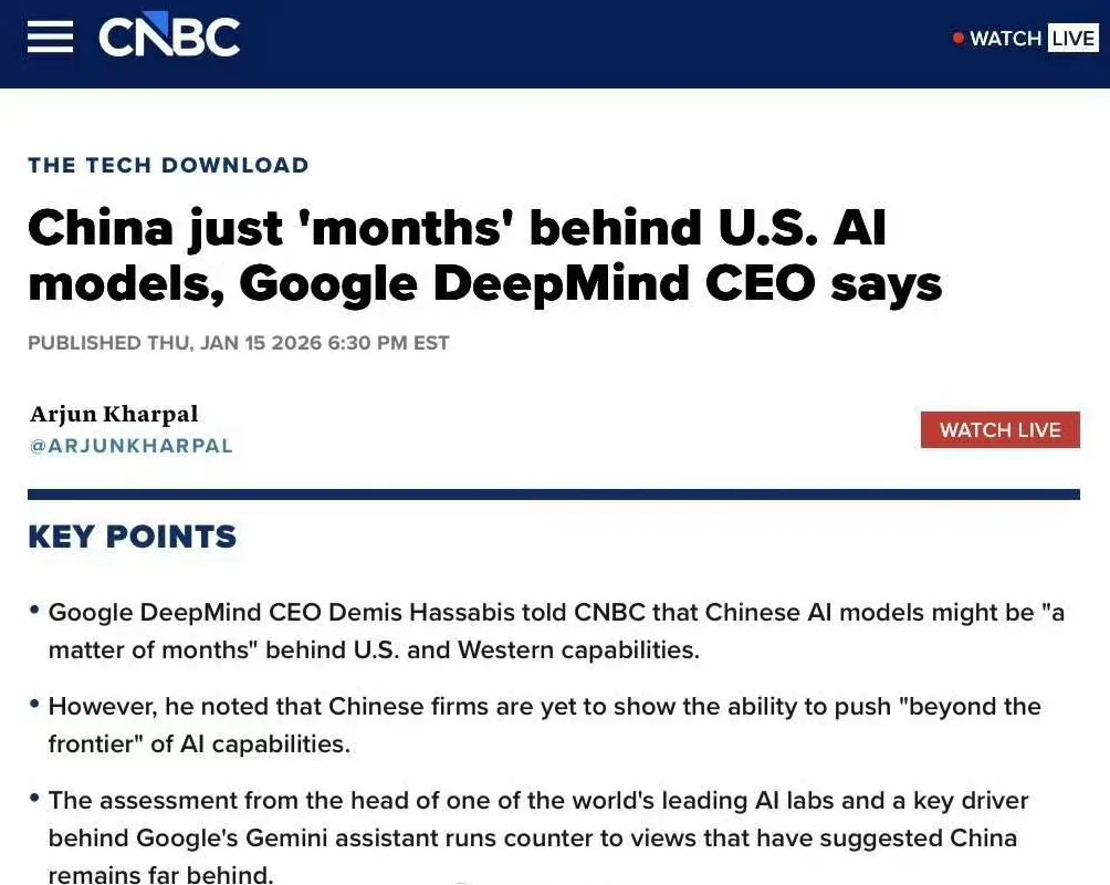 谷歌旗下人工智能公司Google DeepMind高管则发声,中国AI模型水平仅落后美国数月。
