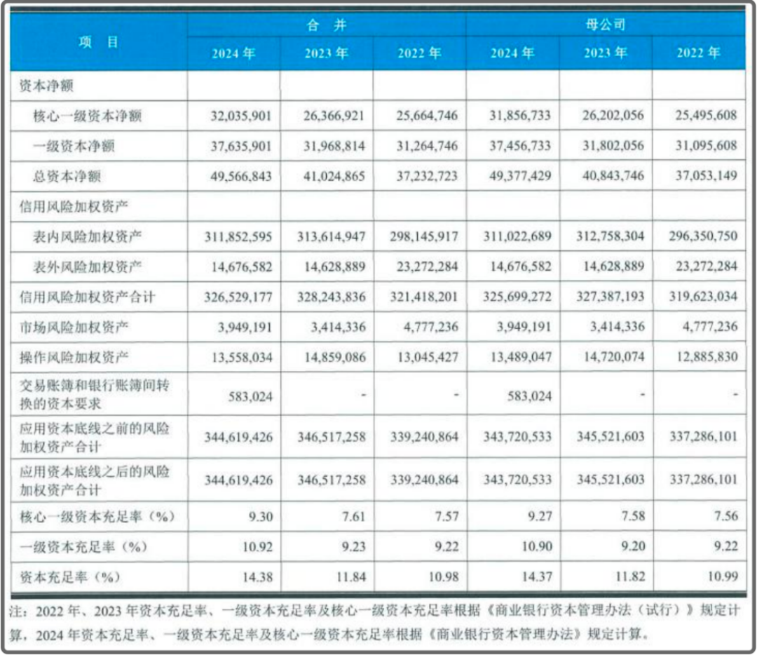 到了2024年,其资本充足率、一级资本充足率、核心一级资本充足率分别提升至14.38%、10.92%、9.3%,三项指标均有所提升。