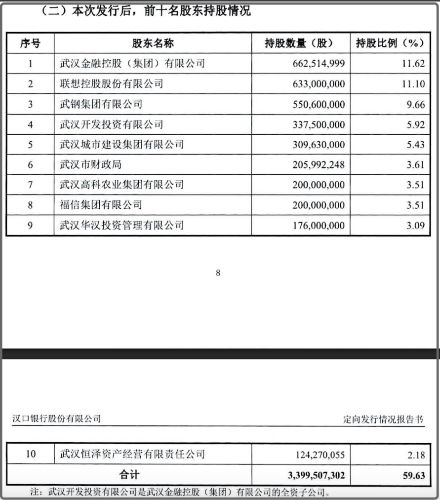 此次增资后,前十大股东名单也随之发生变化,原第一大股东联想控股持股比例由13.11%稀释至11.1%,滑落至第二;原排名第三的武汉金融控股位次上升,取代联想控股成为第一大股东,持股比例11.62%。