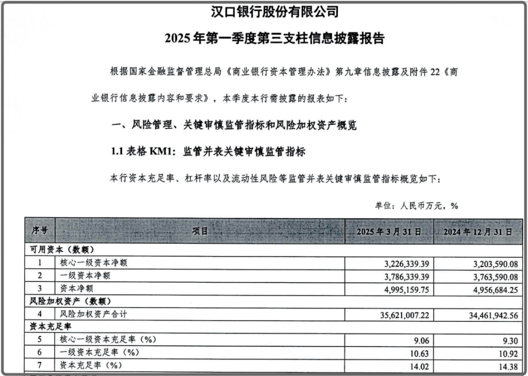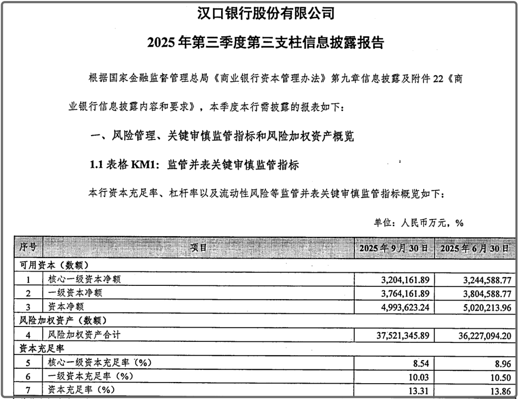 《星岛》注意到,汉口银行2025年第一季度第三支柱信息披露报告显示,去年一季度,汉口银行的资本充足率、一级资本充足率、核心一级资本充足率分别为14.02%、10.63%、9.06%,与2024年末相比均有所降低。2025年第三季度,上述三项数据又分别进一步下滑至13.31%、10.03%、8.54%。