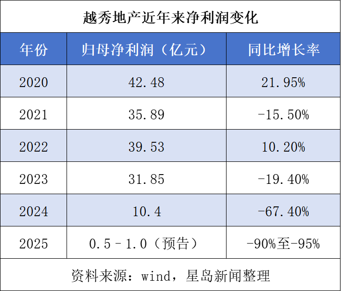 数据显示,2023年及2024年,越秀地产权益持有人应占盈利分别为31.85亿元、10.40亿元,同比降幅分别为19.43%、67.35%;而2025年的预计降幅已达90%—95%,创下近年来降幅纪录。