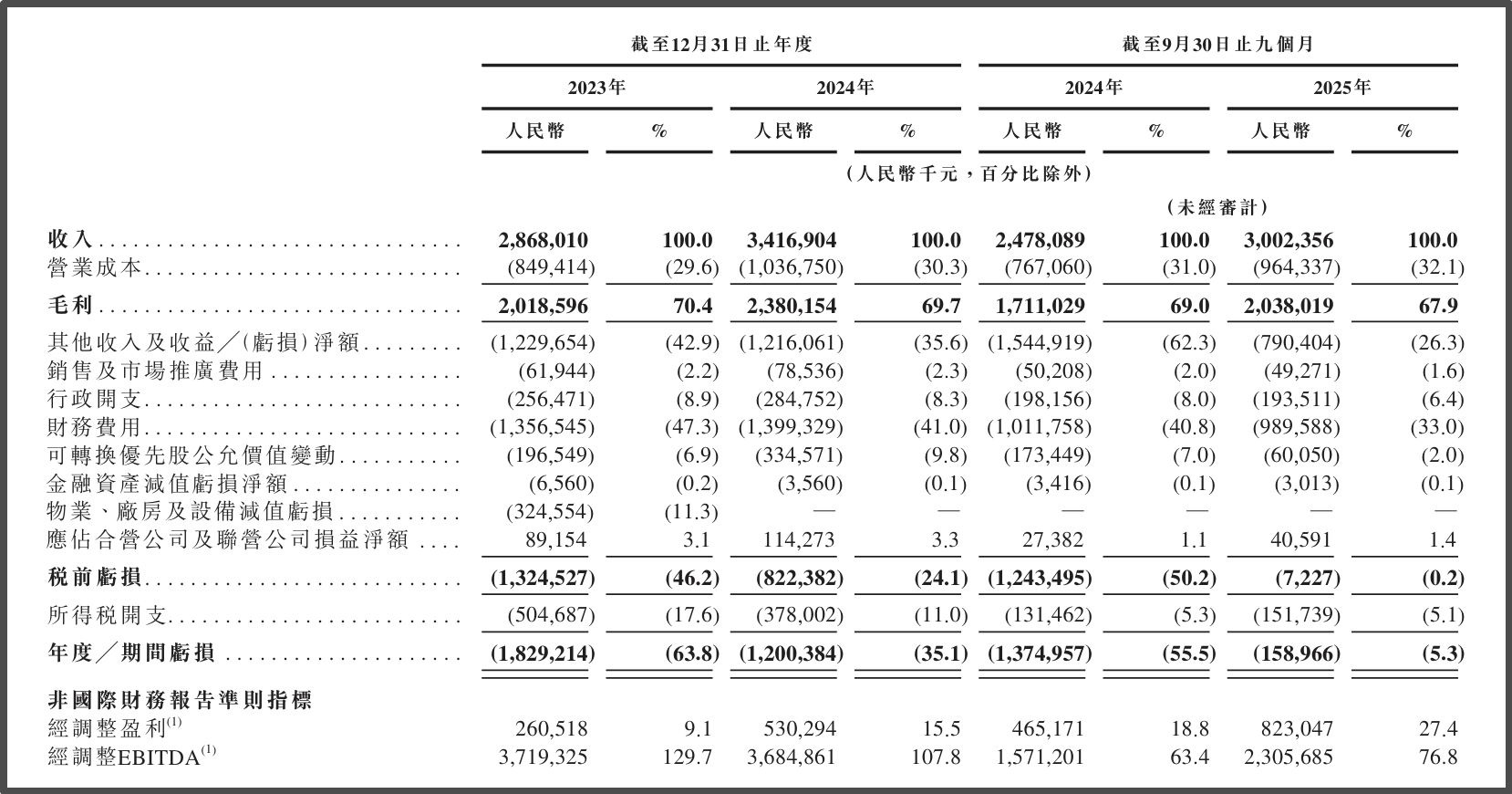 财务数据方面,2023-2024年,该公司的收入从28.68亿元增长至34.17亿元,同比增幅17.2%;2025年前九个月,进一步增长至30.02亿元,同比增幅21.2%。这三个财务会计期间,公司毛利率分别为70.4%、69.7%及67.9%,经调整盈利则分别为2.61亿元、5.30亿元及8.23亿元,盈利规模与盈利能力得到一定提升。