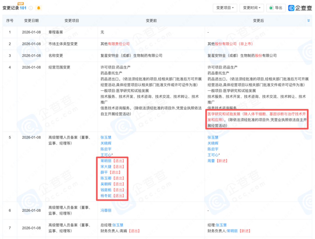 企查查显示,1月8日,复星安特金进行了一系列工商信息变更,涉及高管人员,经营范围名称、市场主体类型变更等。