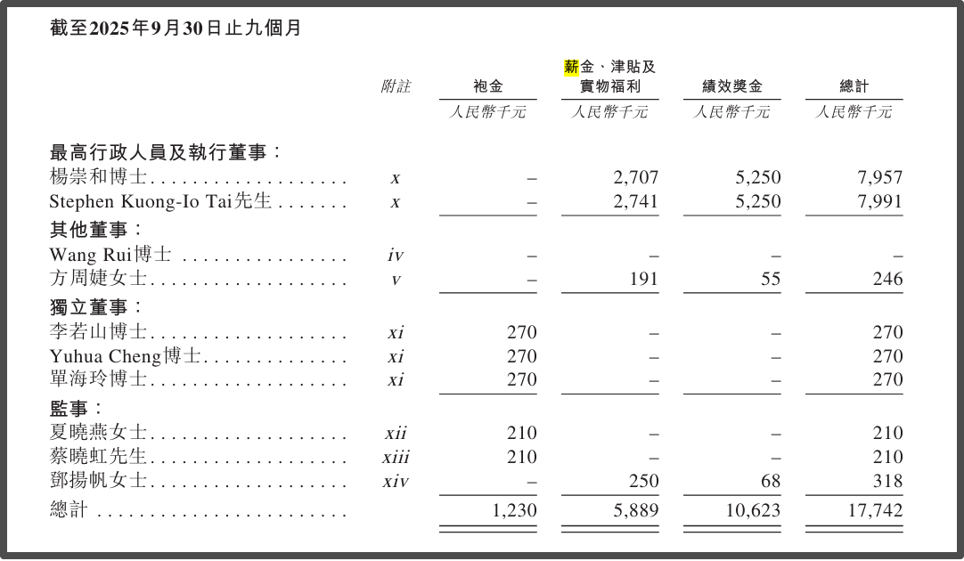 这还不够,根据最新披露的聆讯后资料集,仅2025年前九个月,两人薪酬已分别达到795.7万元和799.1万元,同比继续增长36.72%。