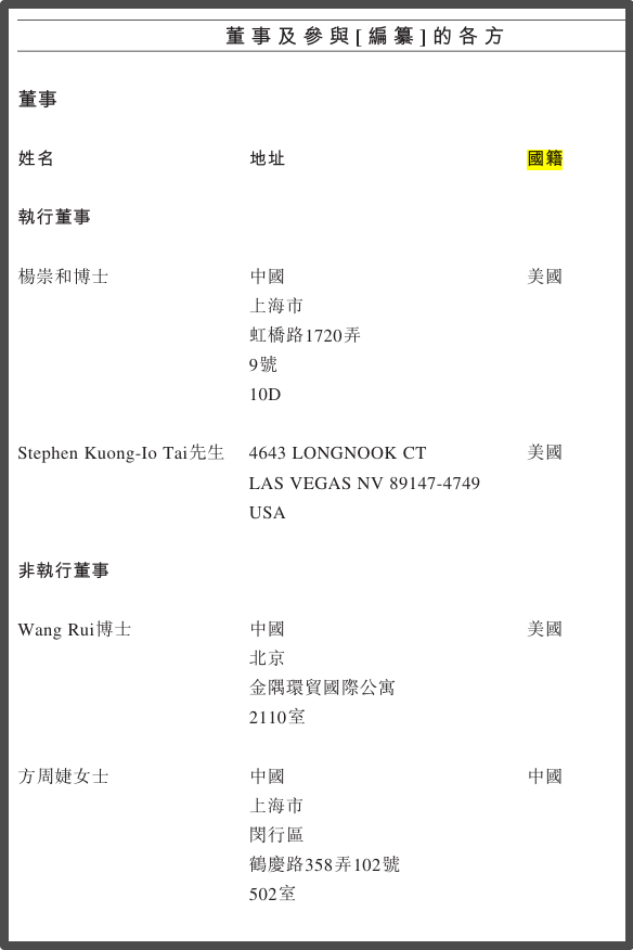 更引人注目的,是其高管团队的背景。公司八位董事中,包括杨崇和与Stephen Tai在内,一半为美国国籍。其中,杨崇和拥有中华人民共和国外国人永久居留权,长期深耕中国半导体产业,却始终保留外籍身份。