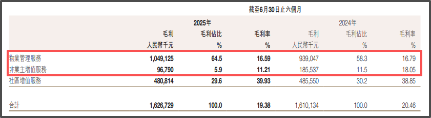 2025年上半年,保利物业实现营收83.92亿元,同比增长6.61%,增幅创下上市以来新低;期内毛利率19.38%,同比下降1.08个百分点,盈利空间持续承压。按业务分,增值服务成为业绩主要拖累因素,其中非业主增值服务收入同比下滑16.1%至8.63亿元,毛利率同步下降6.84个百分点至11.21%;社区增值服务亦下降3.7%至12.04亿元。