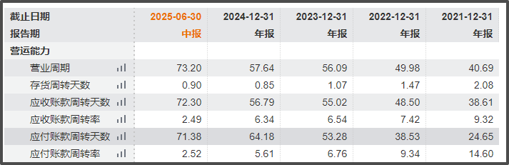 但规模扩张的背后,是应收账款高增带来的回款压力。截至2025年6月底,保利物业贸易应收款项及应收票据约39.26亿元,同比增加39.42%,其中第三方应收款项占32.8亿元。同时Wind数据显示,期末保利物业应收账款周转天数达到72.3天,创下近年新高,对公司现金流形成不小考验。