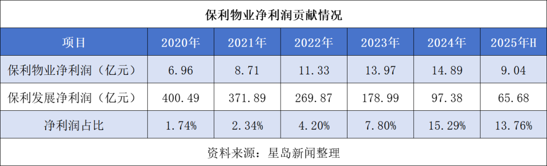 数据显示,2020—2024年,保利发展的净利润逐年下滑,而保利物业的净利润贡献比例从1.74%提升至15.29%;2025年上半年,这一比例也达到了13.76%。加上保利发展于1月19日公告预告,2025年公司归母净利润仅10.26亿元,同比下降79.49%,未来保利物业的利润占比或将进一步提升,成为集团盈利的重要支撑。