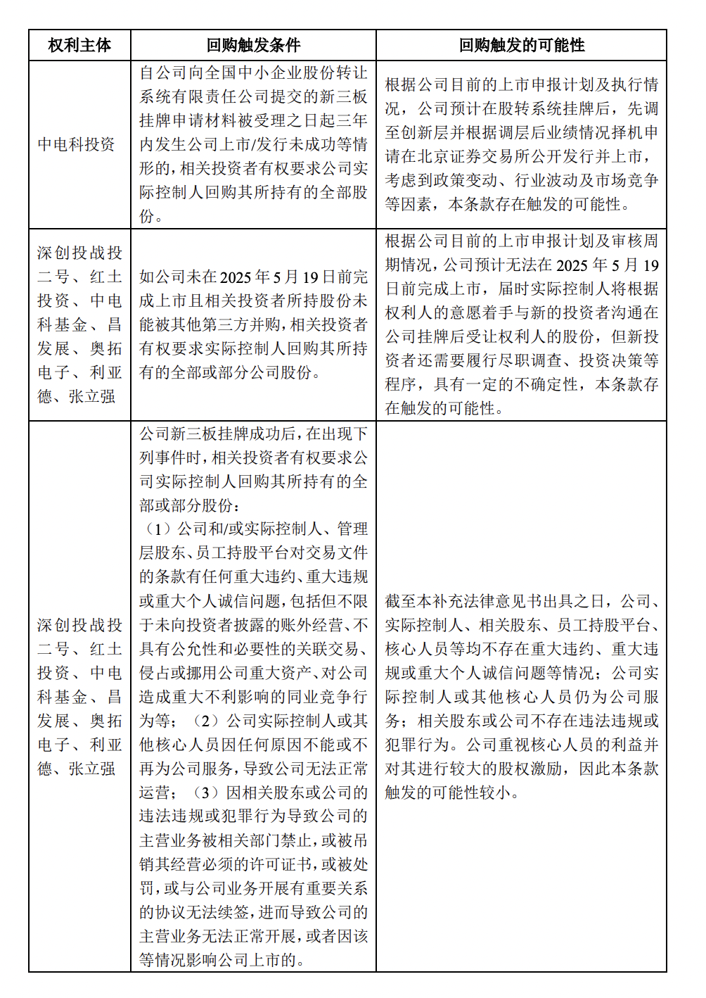 深创投战投二号、红土投资(截至2025年6月30日持股比例5.02%)等机构及个人投资方,若2025年5月19日前公司未能上市且股份未被并购,投资者可要求回购全部或部分股份;鉴于当前上市审核周期及流程的复杂性,该条款存在触发的可能性,但具体需结合后续上市进展动态评估。