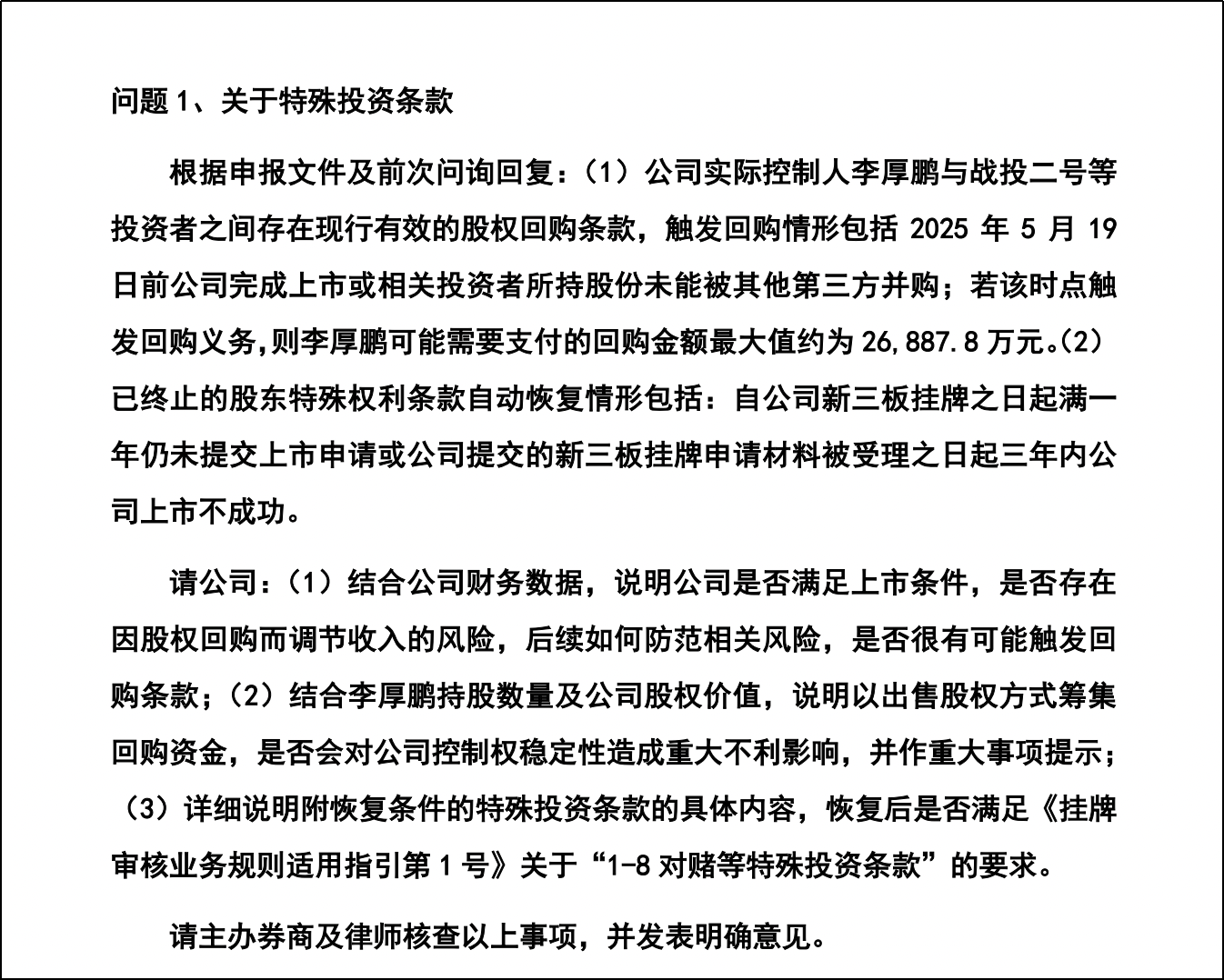 ▲第二轮审核关于特殊投资条款的问询问题