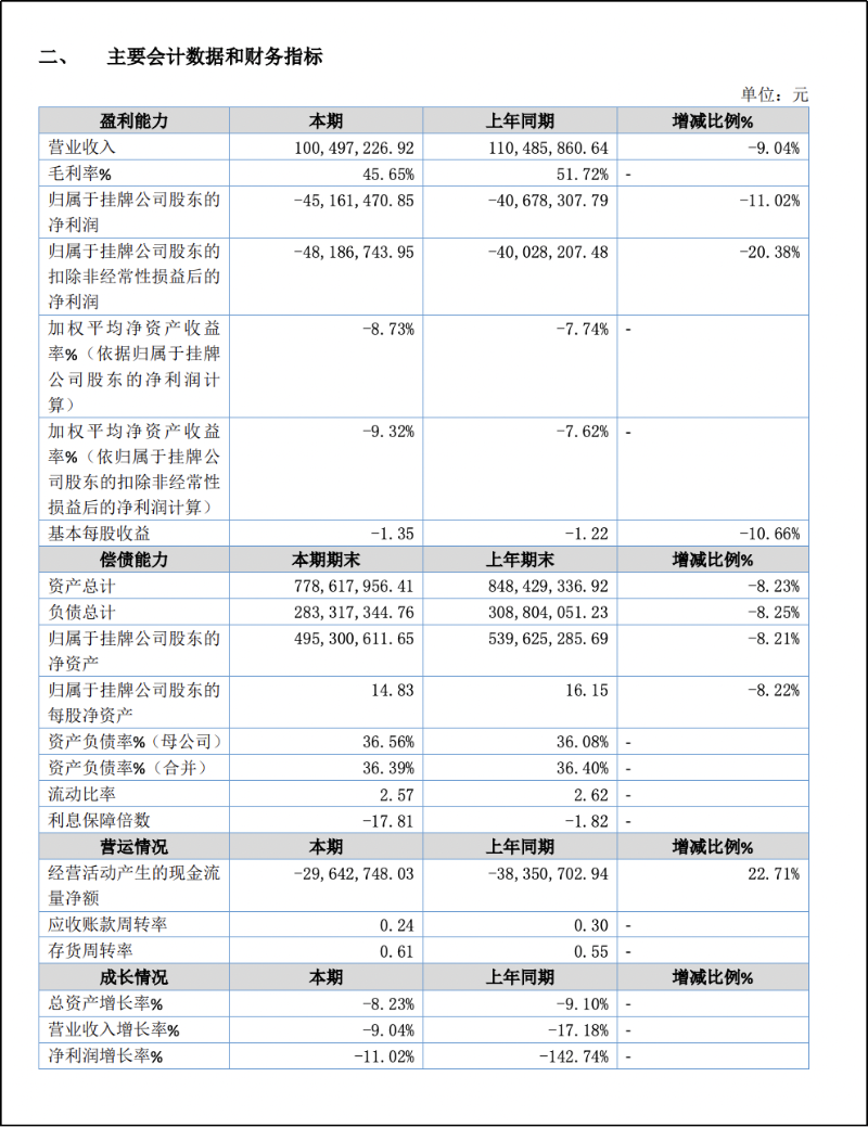 2025年中报数据显示,公司上半年总营收为10049.72万元,同比下降9.04%;净利润和归母净利润均为-4516.15万元,同比下降11.02%;加权平均净资产收益率为-8.73%;净资产为49530.06万元。