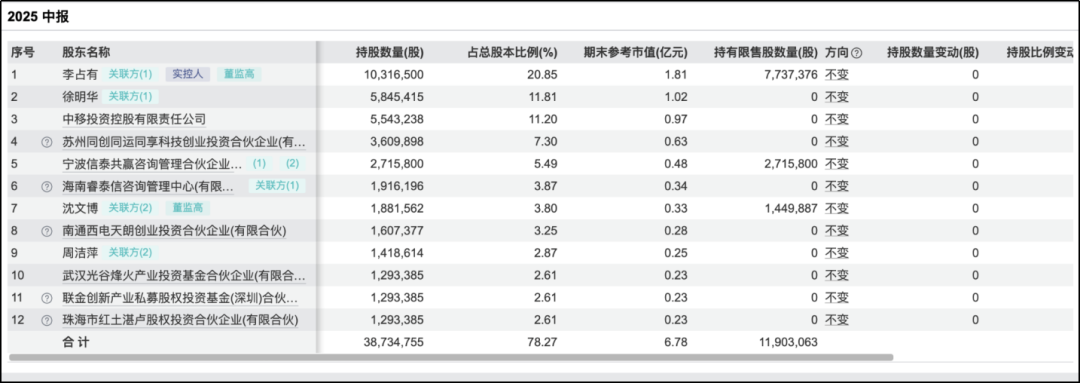 信而泰2025年中报数据显示,法定代表人兼董事长李占有为实际控制人,持股比例占20.85%。除此之外,北京信利和咨询管理中心(有限合伙)的法定代表人徐明华持股11.81%,中移投资持股11.20%。