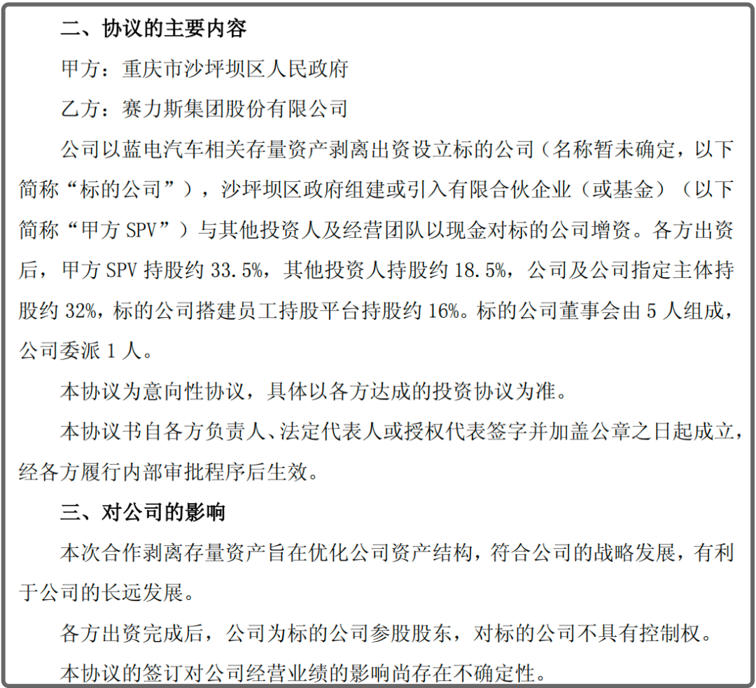 公告显示,赛力斯将以蓝电汽车相关存量资产剥离出资设立标的公司(名称暂未确定,下称“标的公司”),沙坪坝区政府组建或引入有限合伙企业(或基金)(下称“甲方SPV”)与其他投资人及经营团队以现金对标的公司增资。各方出资后,甲方SPV持股约33.5%,其他投资人持股约18.5%,公司及公司指定主体持股约32%,标的公司搭建员工持股平台持股约16%。标的公司董事会由5人组成,公司委派1人。