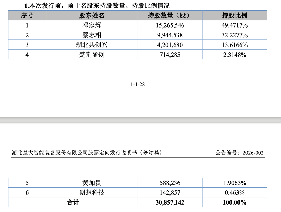 这是楚大智能在2025年8月撤回北交所IPO申请并终止审核后,再度冲击资本市场。值得注意的是,在楚大智能1月14日公布的《湖北楚大智能装备股份有限公司股票定向发行说明书(修订稿) 》中提到,定向发行会对股东持股比例造成一定影响。上电科智研坊和WANG JIEGAO将成为新股东,分别持股3.81%和0.95%,邓家辉持股比例减至47.1159%,仍为公司实际控制人。