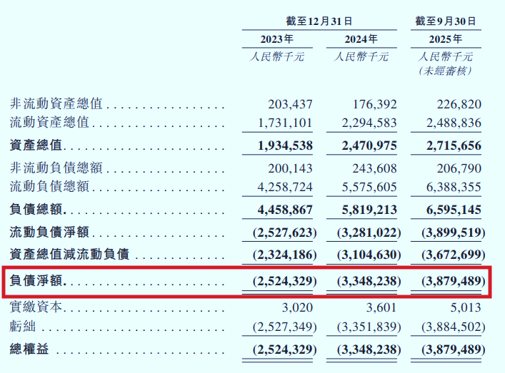 相较于利润表的边际改善,海柔创新的资产负债表状况更为严峻,呈“高危”状态。截至2025年9月底,海柔创新总资产、总负债分别为27.16亿元、65.95亿元,负债净额高达38.79亿元,公司严重“资不抵债”。
