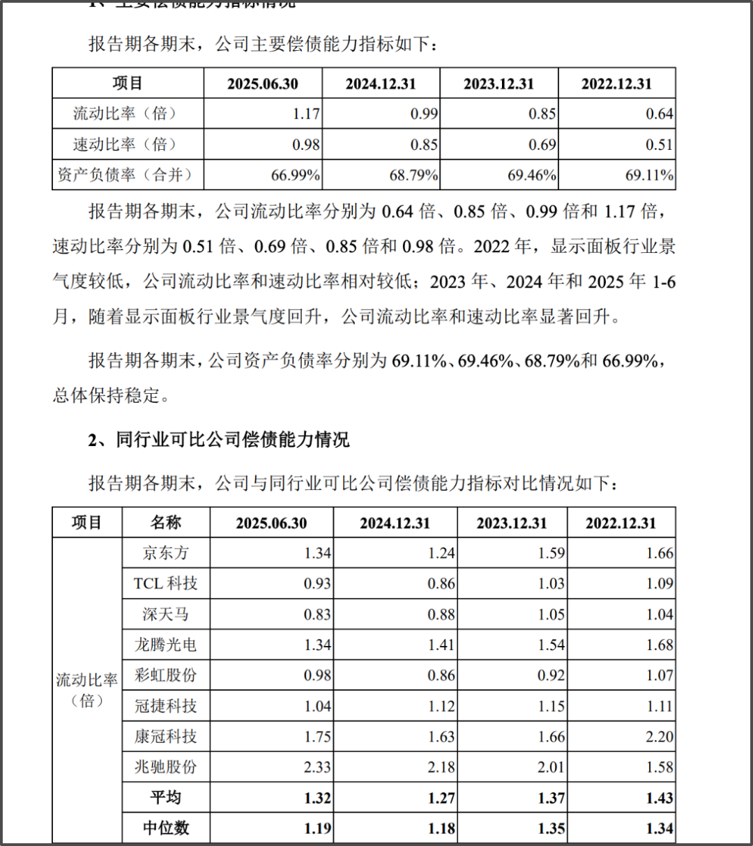 从偿债能力指标来看,惠科股份也面临一定的流动性压力。2022年末至2025年6月30日,惠科股份合并口径资产负债率分别为69.11%、69.46%、68.79%和66.99%,虽呈小幅下降趋势,但仍处于较高水平;流动比率和速动比率虽逐步改善,2025年6月末分别达到1.17倍和0.98倍,但相较于行业平均水平仍存在差距,短期偿债能力有待提升。此外,公司货币资金中包含一定规模的一年以上定期存款和大额存单,流动性受到一定限制,进一步加剧了资金调度压力。