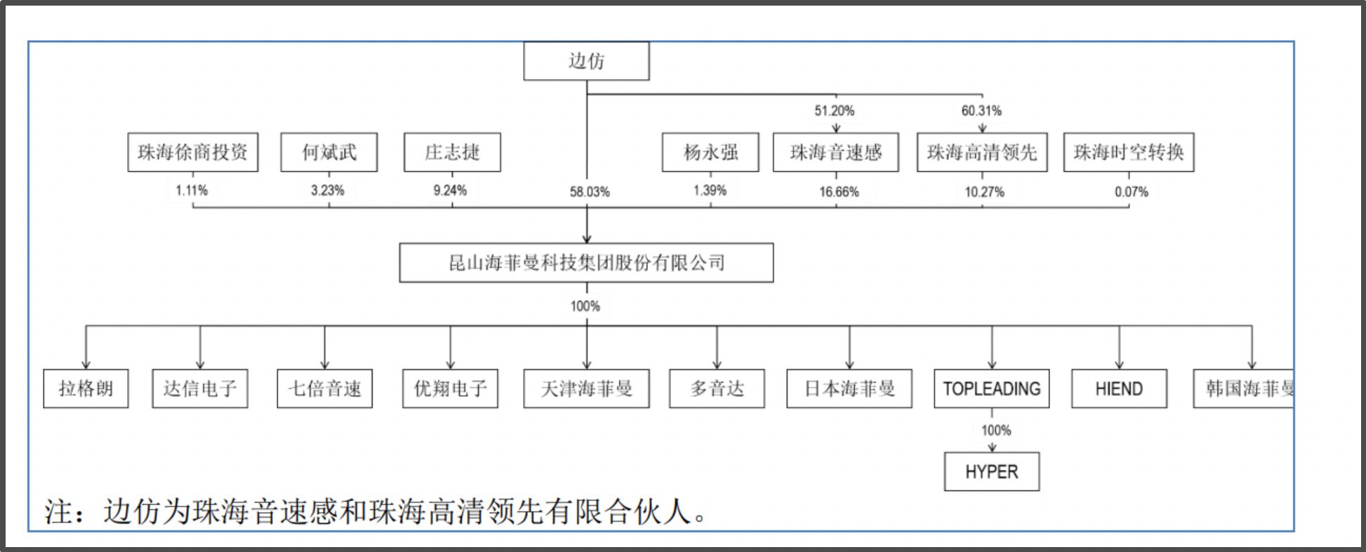 据招股书,边仿直接持有海菲曼58.03%股份,为公司的控股股东。此外,同时边仿作为有限合伙人分别持有第二、第三大股东珠海高清领先、珠海音速感60.31%、51.20%的出资份额。