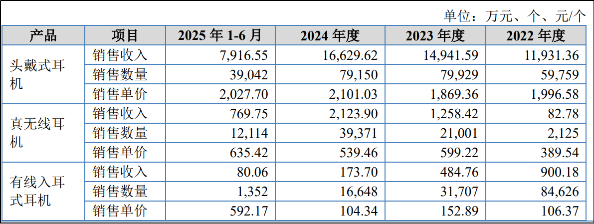 其中,头戴式耳机为公司营收支柱。数据显示,2022至2025年上半年,该品类营收占比均保持在73%以上,平均销售单价超2000元;真无线耳机则为增速最快品类,销售额从2022年的82.78万元增至2024年的2123.90万元,营收占比从0.54%提升至9.37%,形成高端产品引领下的全价位覆盖。