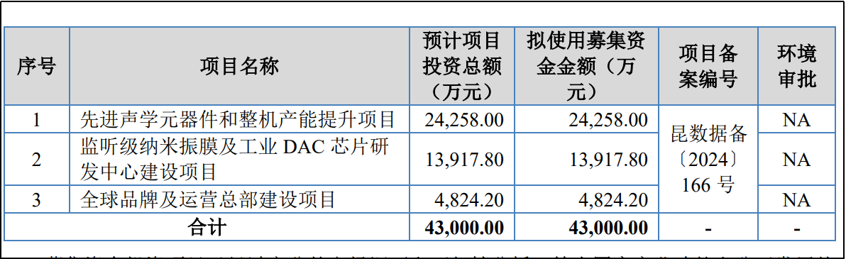 此次海菲曼上市募集的4.3亿元资金,将全部投入三大项目:2.43亿元用于先进声学元器件和整机产能提升项目、1.39亿元用于监听级纳米振膜及工业DAC芯片研发中心建设项目、0.48亿元用于全球品牌及运营总部建设项目。