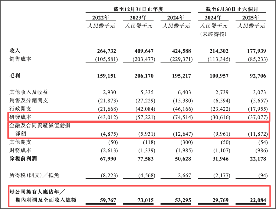 除新增项目减少影响外,由于贸易应收款项及合同资产的预期信用亏损拨备,2024年开始,海纳医药的金融及合同资产减值亏损净额大幅飙升,2022—2024年,分别为487.5万元、593.1万元、1264.7万元,截至2025年上半年,仍高达1187.2万元,同比增长19.18%。